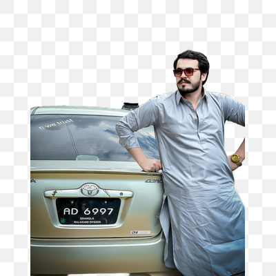 Stylish Man in Grey Shalwar Kameez Leaning on a Toyota Corolla